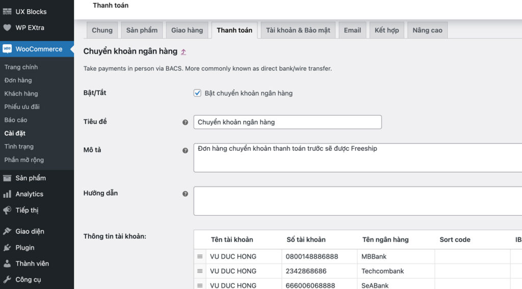 Cấu hình chuyển khoản ngân hàng trong WooCommerce